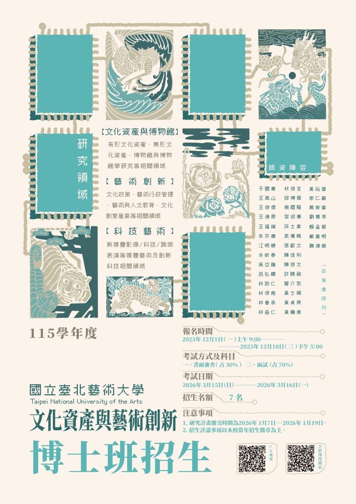 【轉知】國立臺北藝術大學文化資產與藝術創新博士班115學年度招生訊息