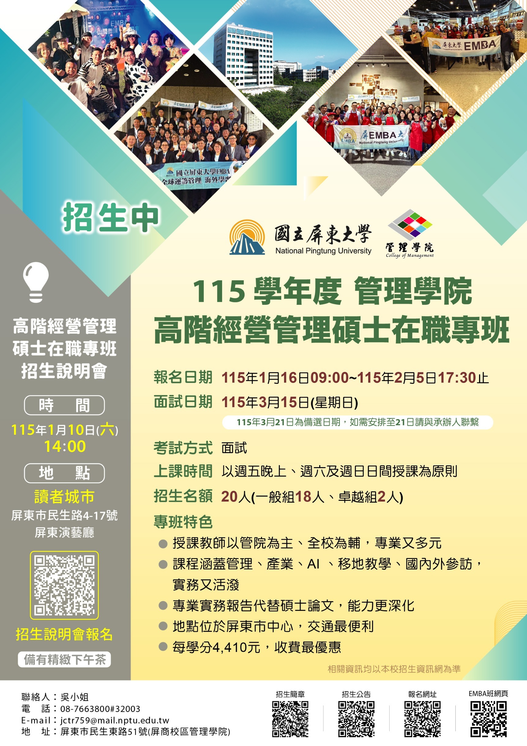 【招生】國立屏東大學115學年度管理學院高階經營管理碩士在職專班EMBA招生中